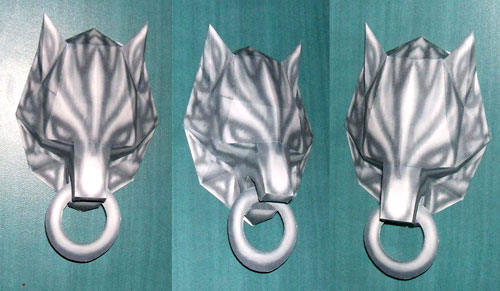 Modelo de papercraft de una argolla para tocar la puerta con modelo de lobo